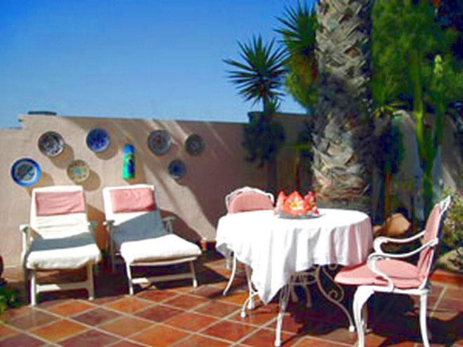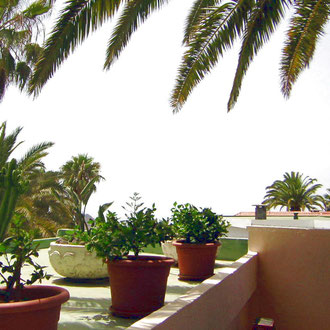Der Blick geht hinaus auf die kleine Dachterrasse und zum Meer.